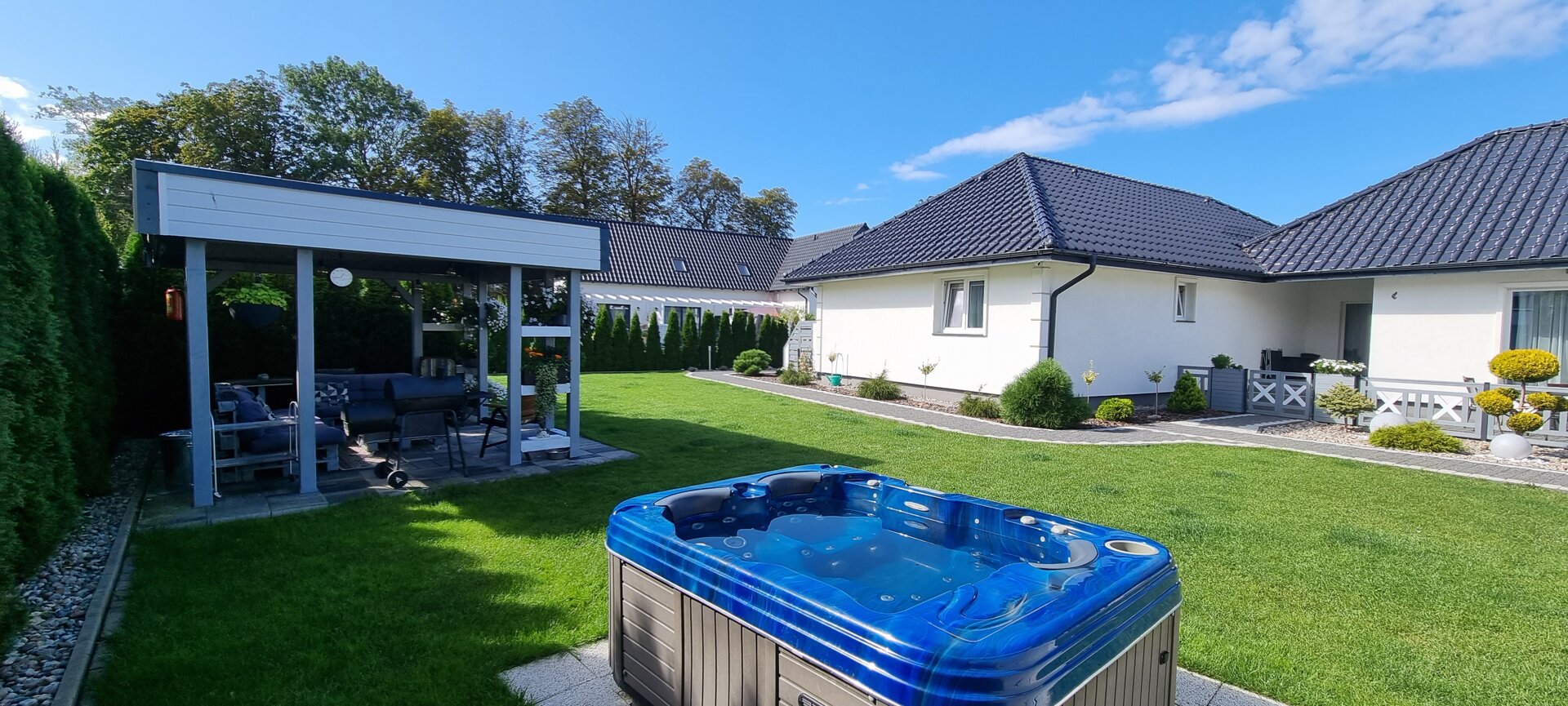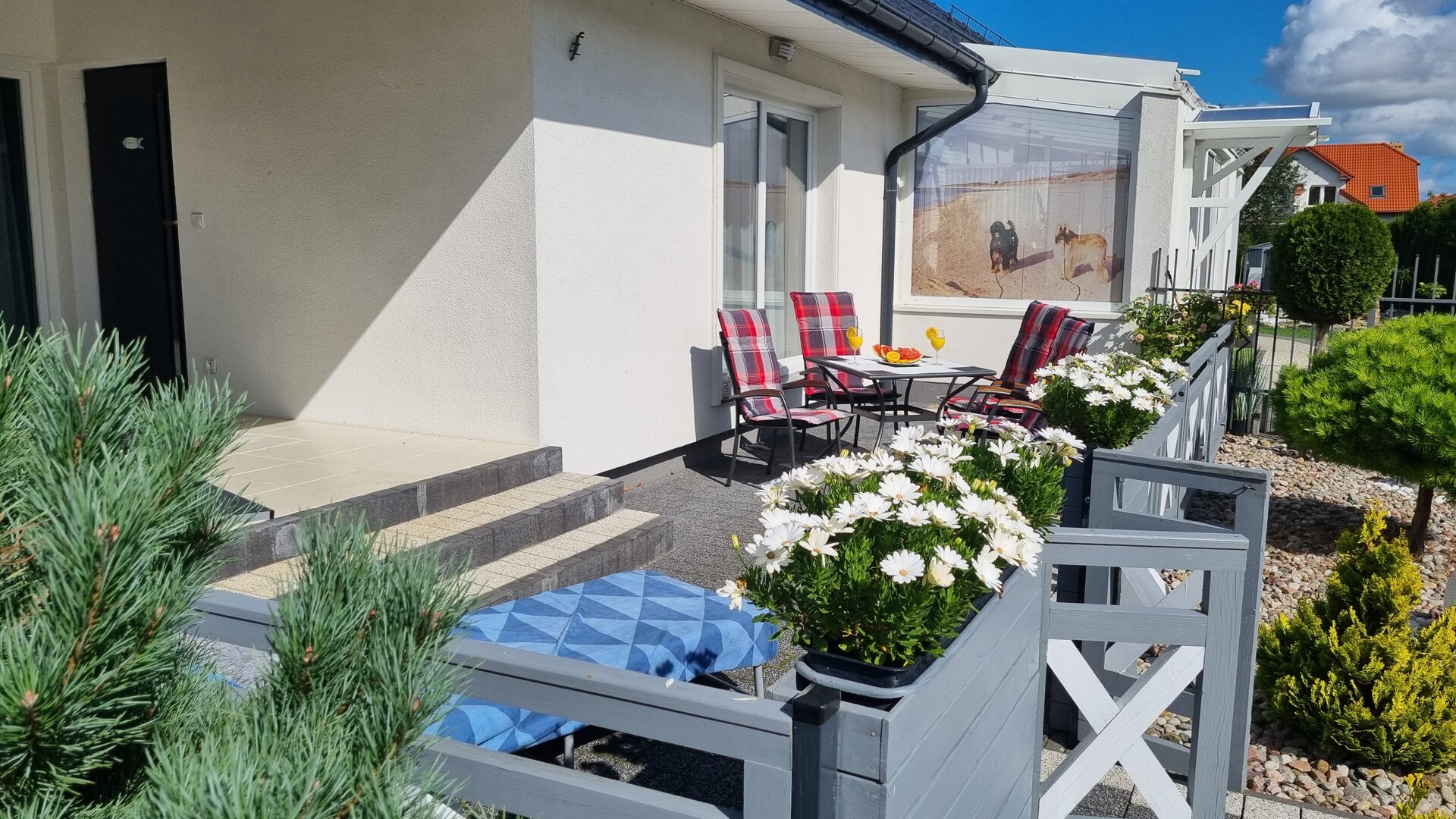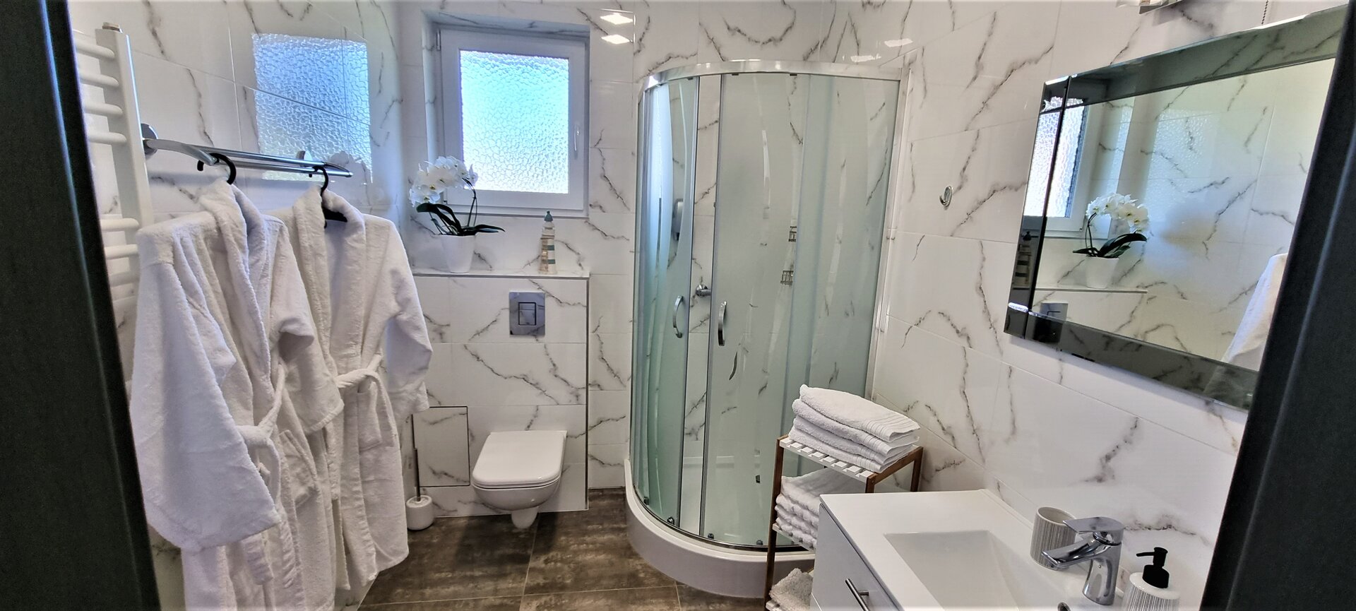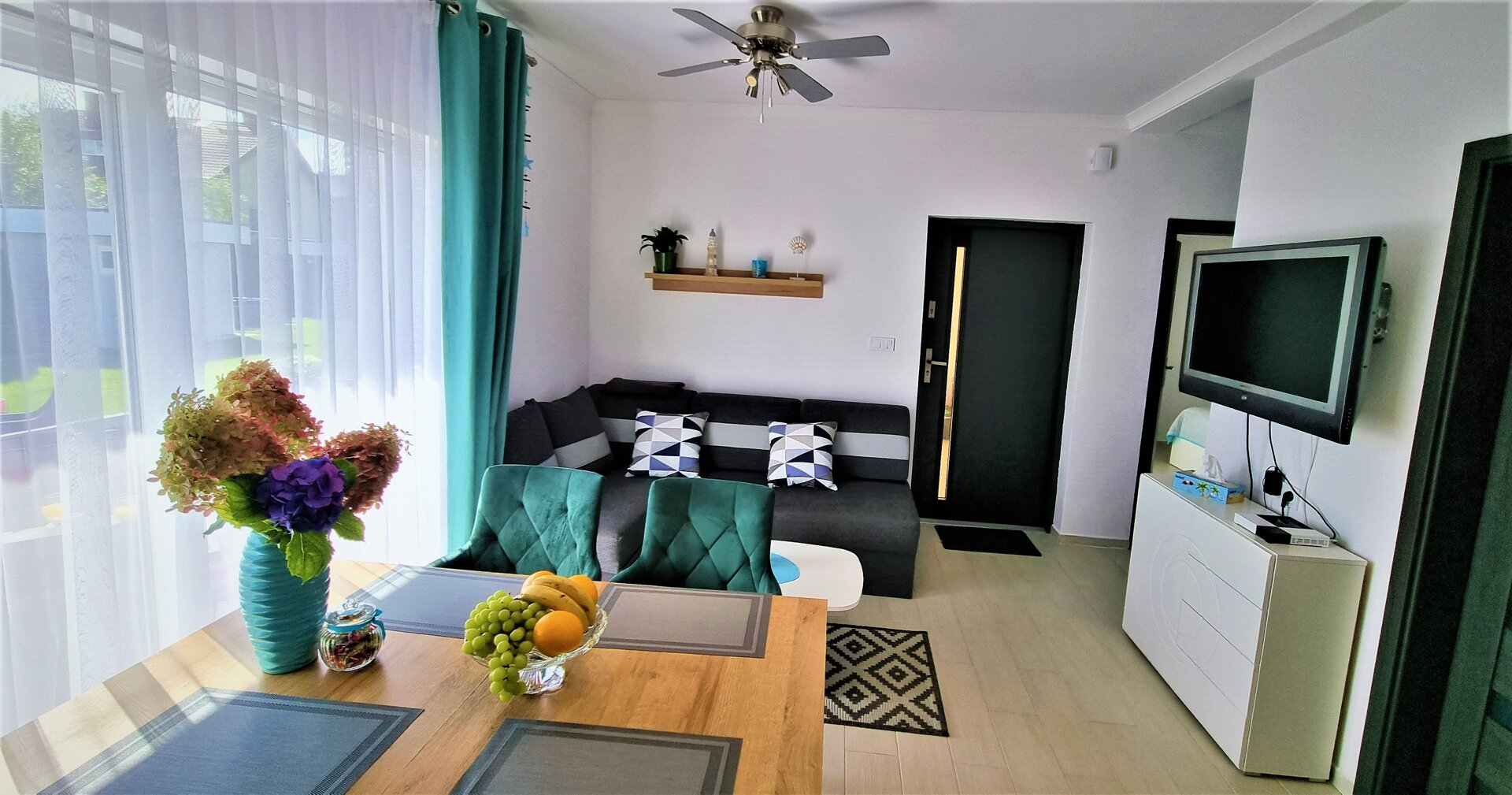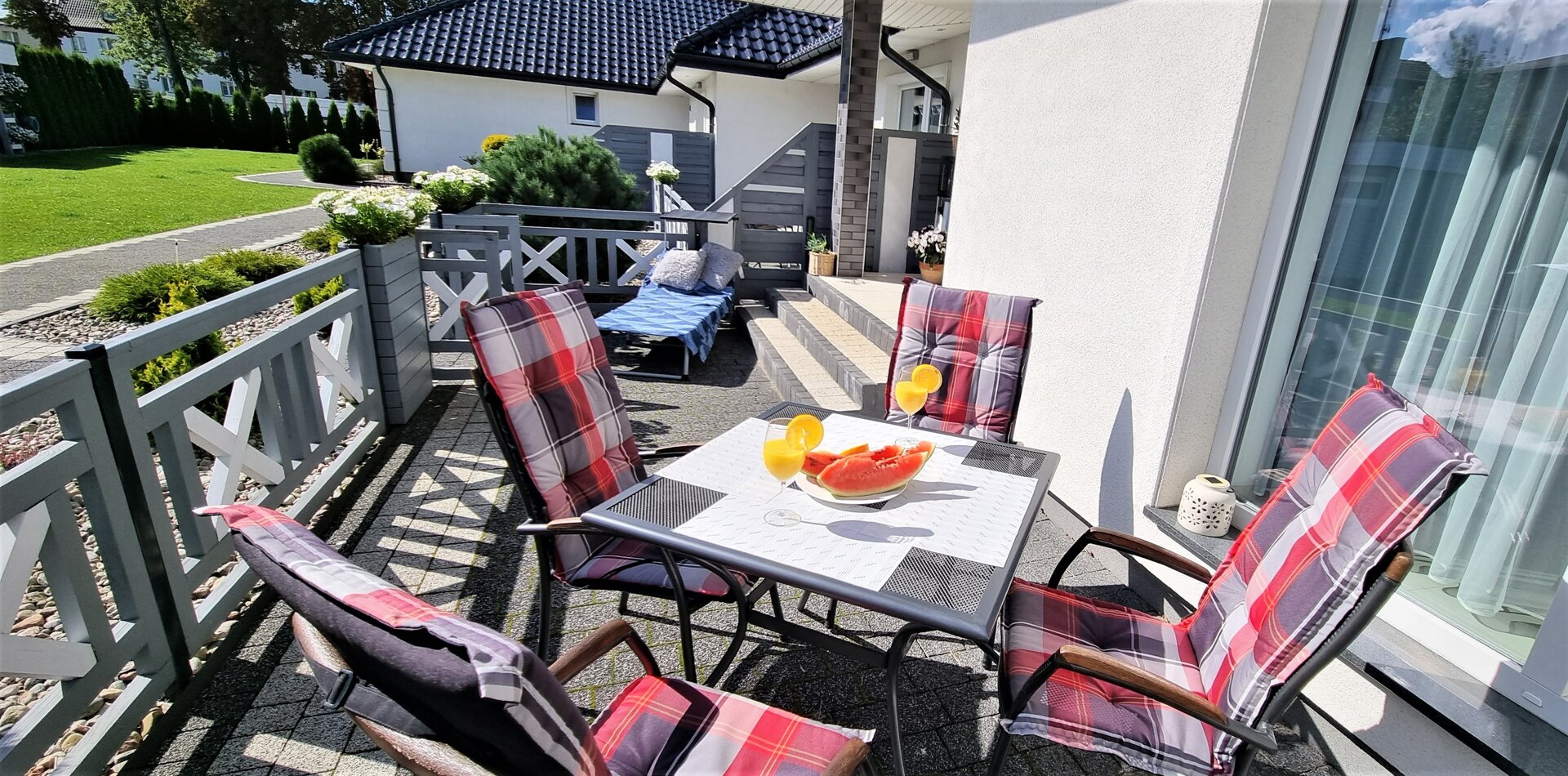 Apartament z dwoma sypialniami oraz aneksem kuchennym. Wnętrza zostały urządzone w nowoczesnym stylu i utrzymane w jasnej kolorystyce. Apartamenty są wyposażone w telewizor z płaskim ekranem, bezprzewodowy Internet, aneks kuchenny w pełni wyposażony, również w podstawowe środki czystości. Każdy apartament posiada ogrodzony taras z meblami ogrodowymi. W każdym apartamencie znajduje się prywatna łazienka z kabiną prysznicową, ręcznikami i suszarką do włosów oraz podstawowym zestawem kosmetyków.